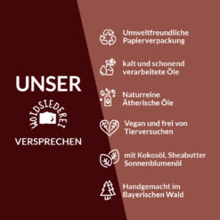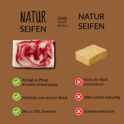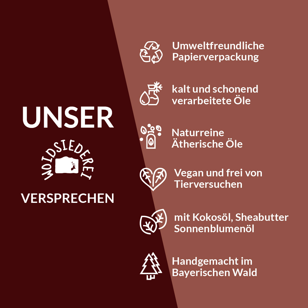 Gefertigt mit viel Sorgfalt in unserer Seifenmanufaktur im Bayerischen Wald enthält sie hochwertige Pflanzenöle wie Sheabutter, Kokos- und Sonnenblumenöl. Diese pflegen deine Haut intensiv und sorgen für ein samtweiches Gefühl – ohne auszutrocknen. Die 10 % Überfettung machen die Seife besonders mild und rückfettend, ideal für tägliches Duschen oder Händewaschen.