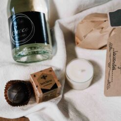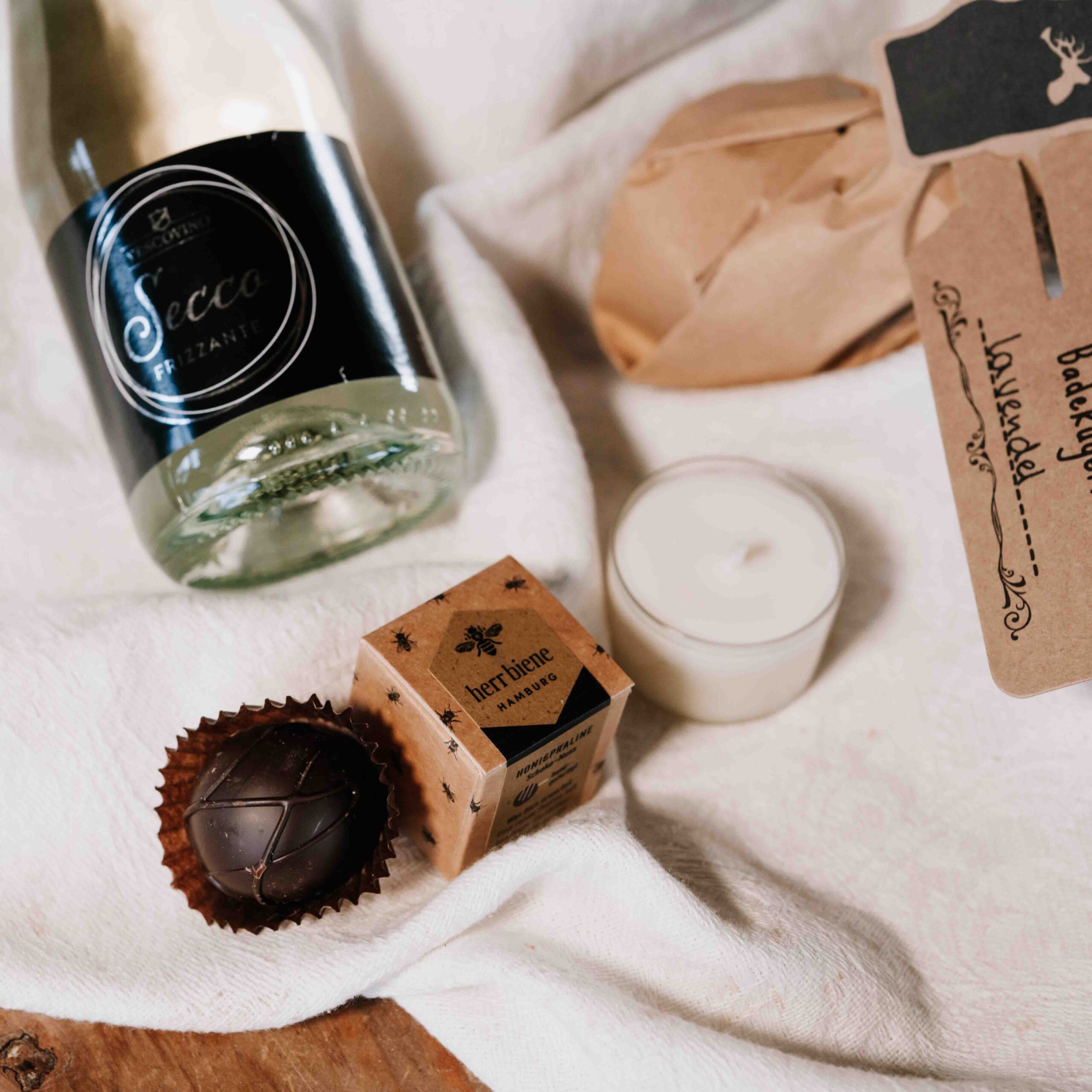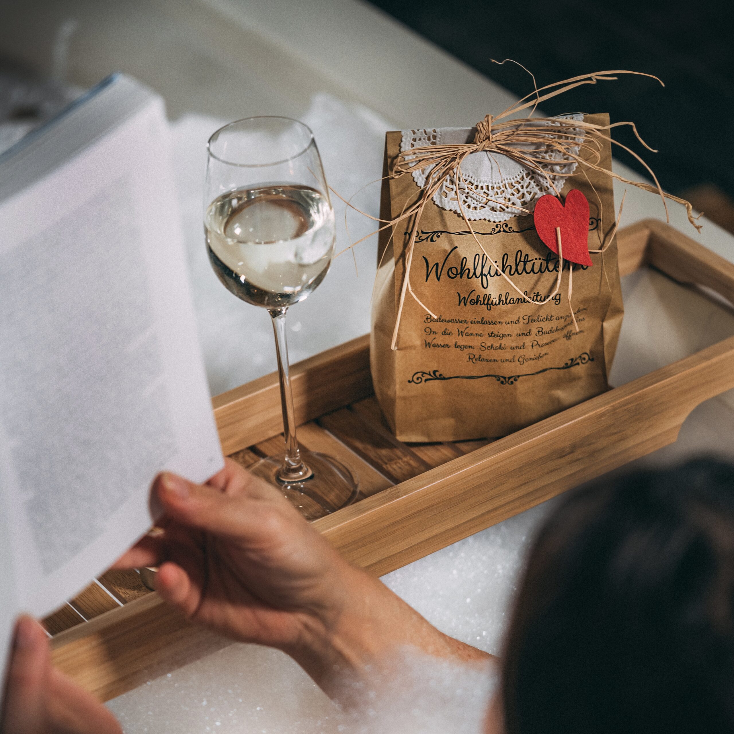 Ein liebevoll zusammengestelltes Wohlfühltüterl für eine kleine Auszeit: Mit handgemachter Badekugel, zartschmelzender Schokolade, einem Teelicht und prickelndem Prosecco – alles für 30 Minuten puren Genuss in der Badewanne.